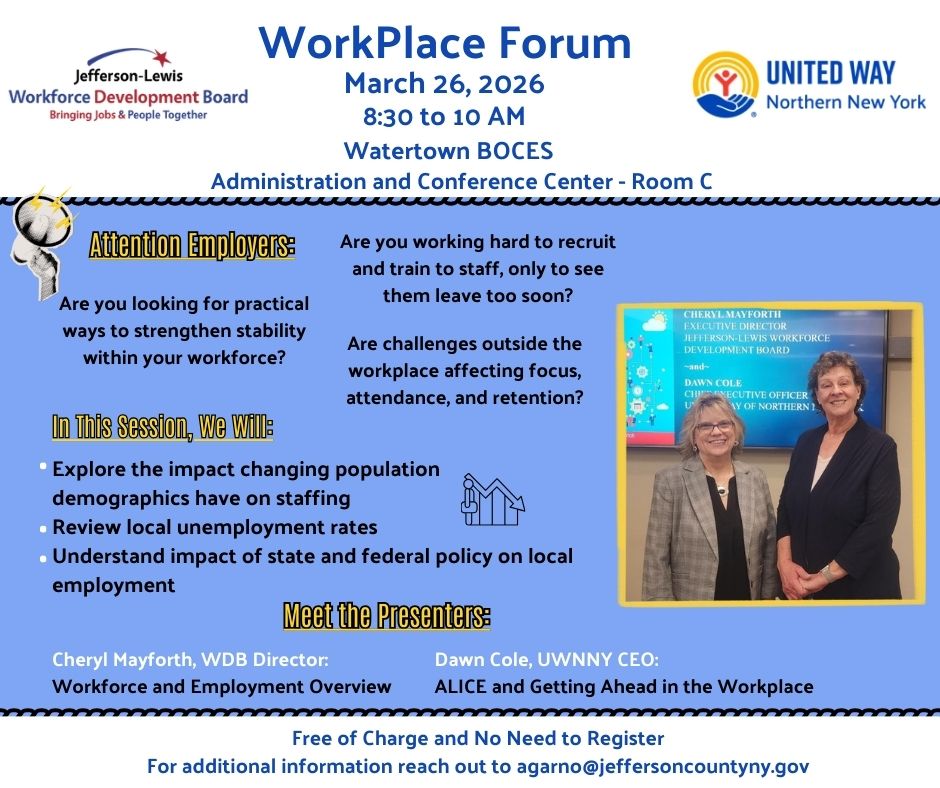 Hosted in collaboration with the Jefferson-Lewis Workforce Development Board and United Way of Northern New York, the forum will take place on Thursday, March 26 from 8:30 to 10 AM at the Jeff-Lewis BOCES Administration and Conference Center (Room C), located at 20104 Arsenal Street in Watertown. Together, we will explore current workforce trends and share practical strategies to strengthen employee stability and retention.