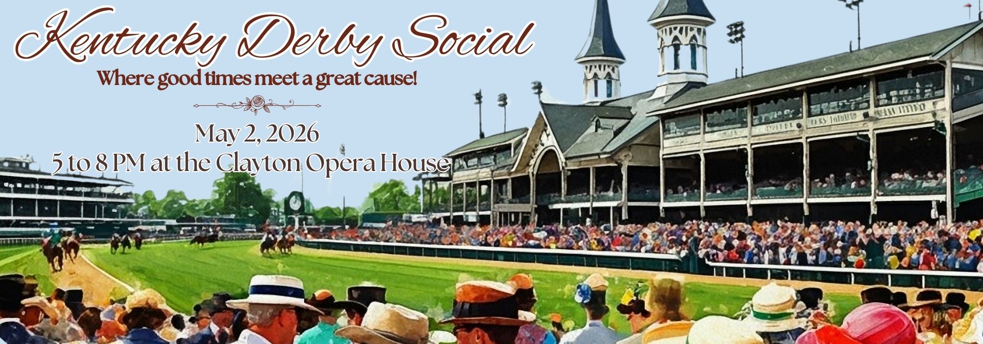 The 2026 Kentucky Derby Social is a nod to the past with an eye toward the future—tradition with a twist, if you will. You can expect beloved signature elements alongside a few new surprises to keep things fresh and exciting. We’re thrilled to return to the Clayton Opera House on Saturday, May 2, 2026, for an evening of elegance and energy. Enjoy live coverage of the race, hosted by the North Country’s favorite emcee, Mel Busler. Joe and Shannon Foy will set the tone with their musical stylings, while Buffy returns with her signature sips—hand-crafted cocktails and perfect pours courtesy of O’Brien’s Restaurant and Bar.