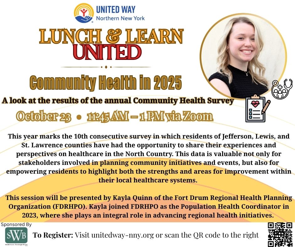 Fort Drum Regional Health Planning Organization (FDRHPO), in partnership with the North Country Health Compass Partners, began outreach to community members for the 2025 Community Health Survey in early June.This year marks the 10th consecutive survey in which residents of Jefferson, Lewis, and St. Lawrence counties have had the opportunity to share their experiences and perspectives on healthcare in the North Country. This data is valuable not only for stakeholders involved in planning community initiatives and events, but also for empowering residents to highlight both the strengths and areas for improvement within their local healthcare systems.For 2025, new questions regarding social determinants of health (SDOH) have been included to align with the updated New York State Department of Health (NYSDOH) Prevention Agenda for 2025-2030.Conducted annually, the survey gathers adults’ thoughts and experiences regarding healthcare. Responses remain anonymous and are utilized to evaluate the effectiveness of local programs, identify specific health needs within the community, and develop plans to address these needs.