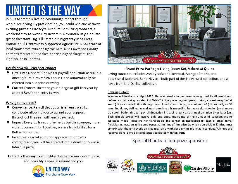 It’s that time of year again, with workplace campaigns taking place across the North Country in support of our Community Impact work. New this year are more prize incentives, campaign videos from our partner agencies talking about their programming, and a more streamlined pledge portal process!