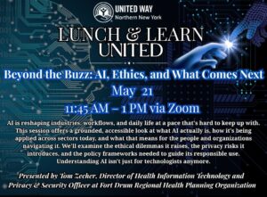 United Way of Northern New York is excited to continue our professional development series, “Lunch & Learn United,” sponsored by Watertown Savings Bank, on a bi-monthly basis. This free virtual series aims to provide valuable insights and knowledge to our local communities on a range of important topics relevant to today’s workplace.
